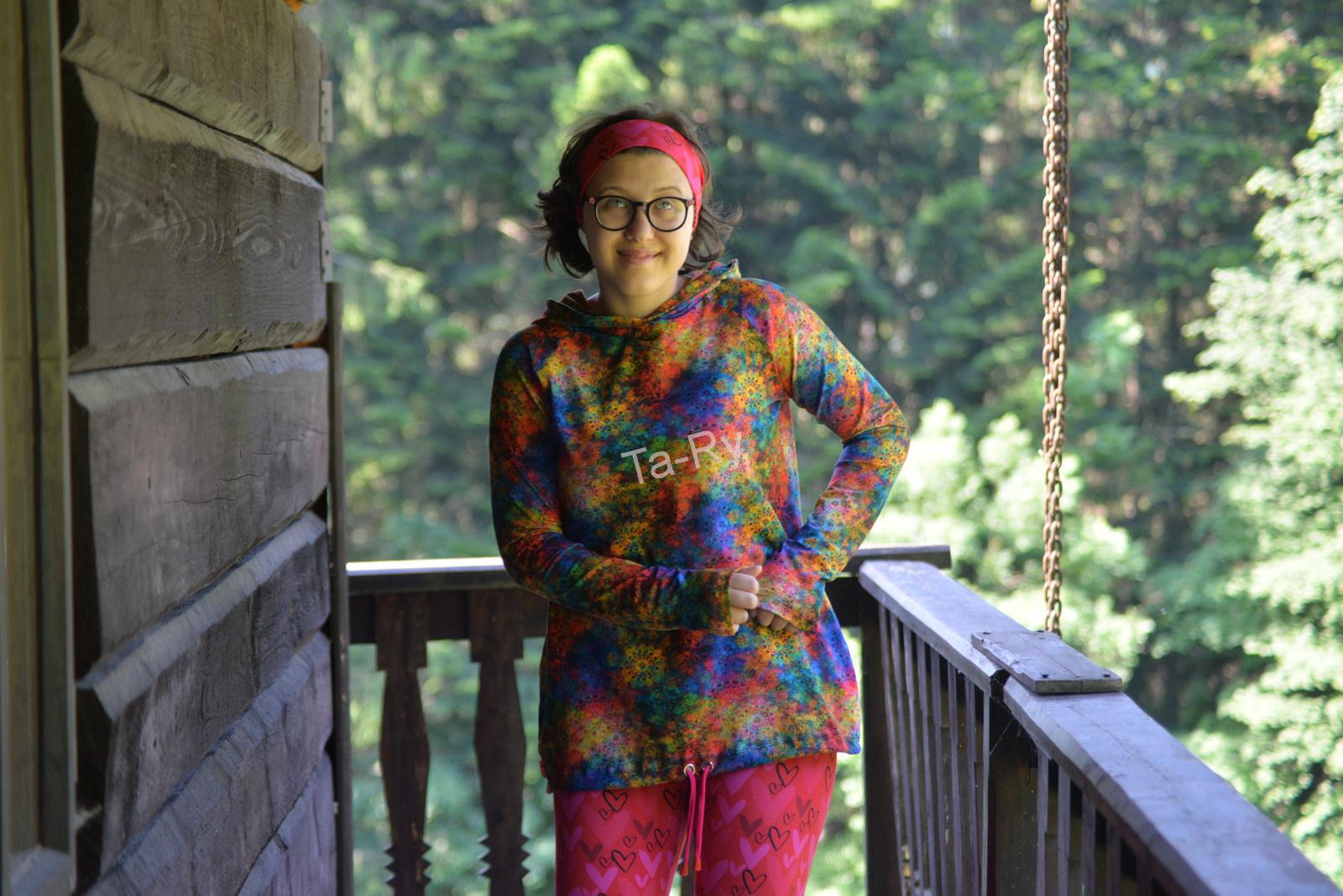 Dámská originální barevná a veselá....Je ušita z úpletu - úplně ideální na léto jako lehká mikča, nebo v průběhu roku jako triko s kapucí....