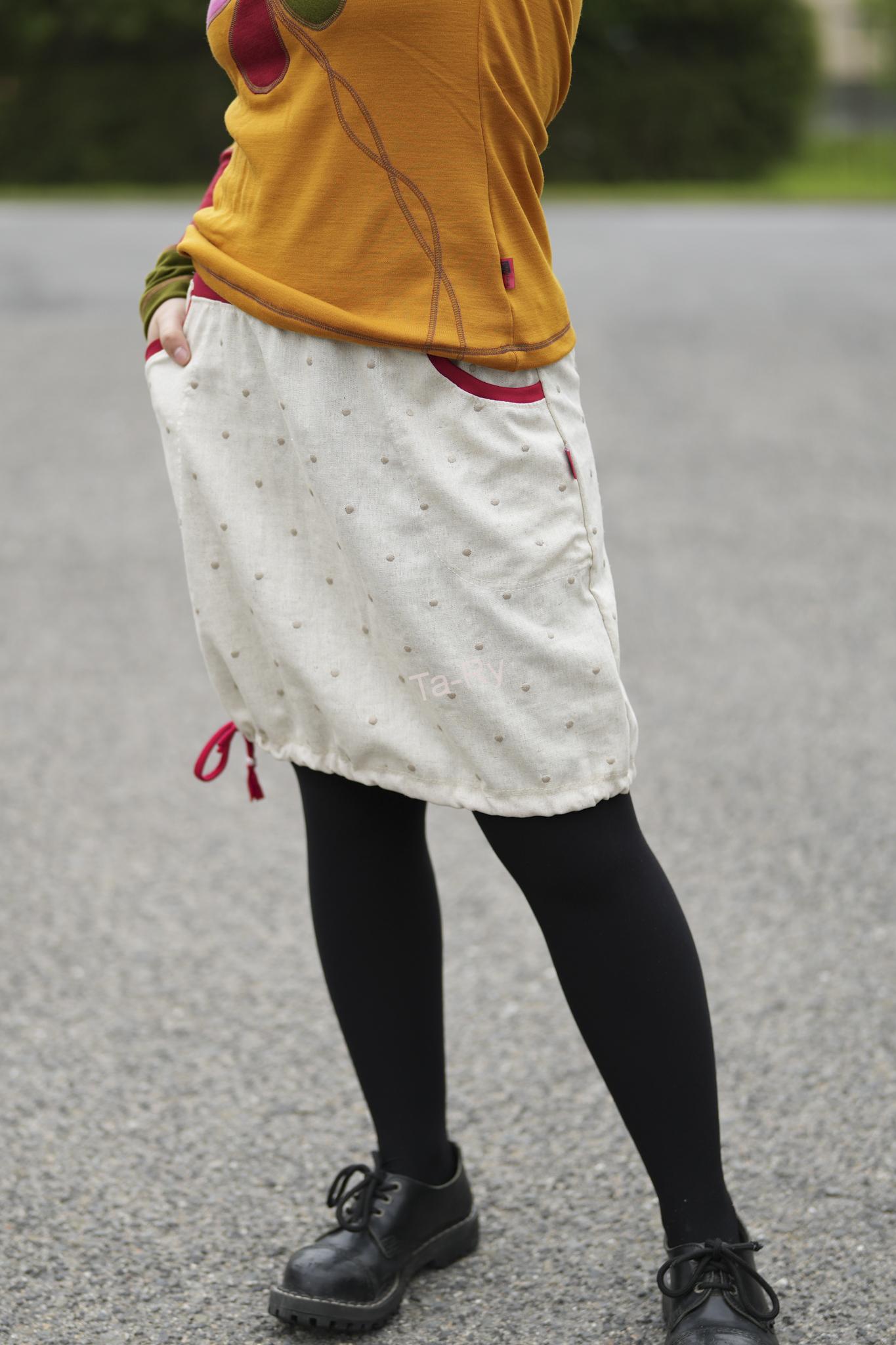 Krásná a příjemná sukýnka z lněné látky s puntíky. Dole je tkanička na zatažení, pro vytvoření balonkového efektu.